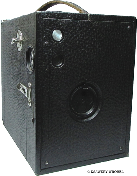 The Conley’s Kewpie No. 3A model was manufactured from 1917 to 1922. It is a postcard format box camera. Like so many other box cameras it has two reflecting type finders, one for horizontal and one for vertical exposures. The image here shows that the camera is inside as outside a wooden construction. But since it’s covered with leatherette its more characteristic attribute is the aperture selection dial with four holes in front of the lens.
